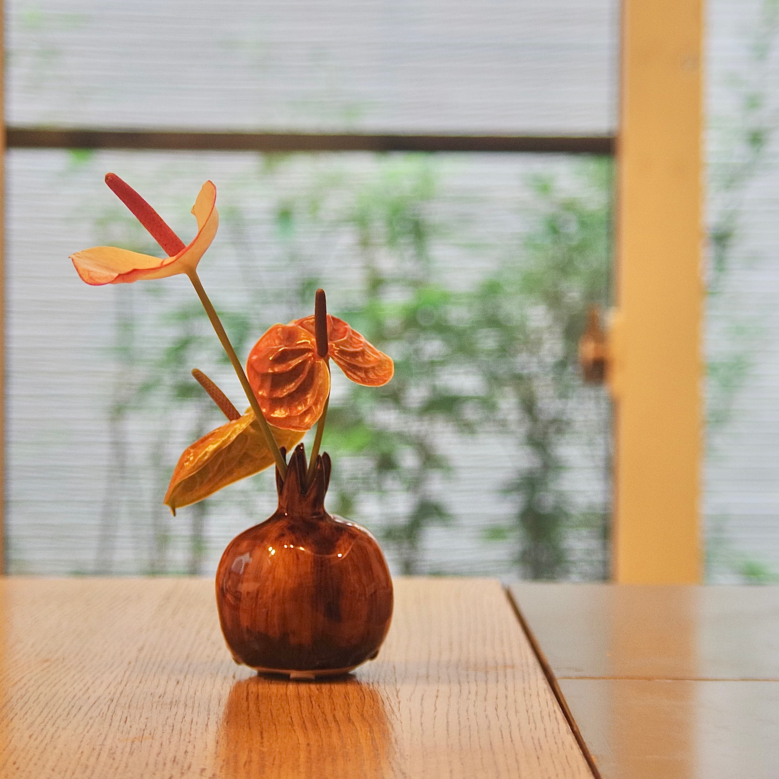 花の美しさを引き立てる、オレンジブラウンのグラデーションカラーが魅力的なflower base 006。柘榴の形をした花瓶は、幅7cm、高さ9cmのコンパクトさで、一輪から3輪程度のお花を飾るのがおすすめです。お部屋に馴染みやすいカラーで、落ち着いた暖かい空間を演出します。