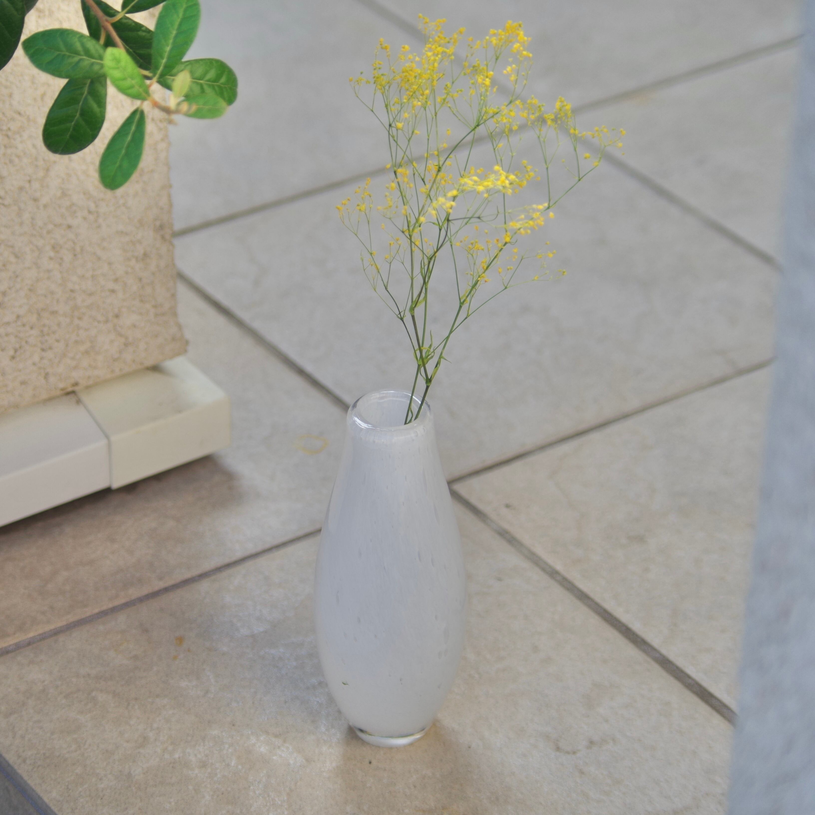 flower base 009は、ホワイトカラーの濃淡と気泡が美しい花瓶です。幅5cm、高さ15cmのコンパクトなサイズ感で、一輪や小枝を飾るのに最適です。シンプルなデザインながらもおしゃれな雰囲気を演出し、インテリアのアクセントになること間違いなしです。