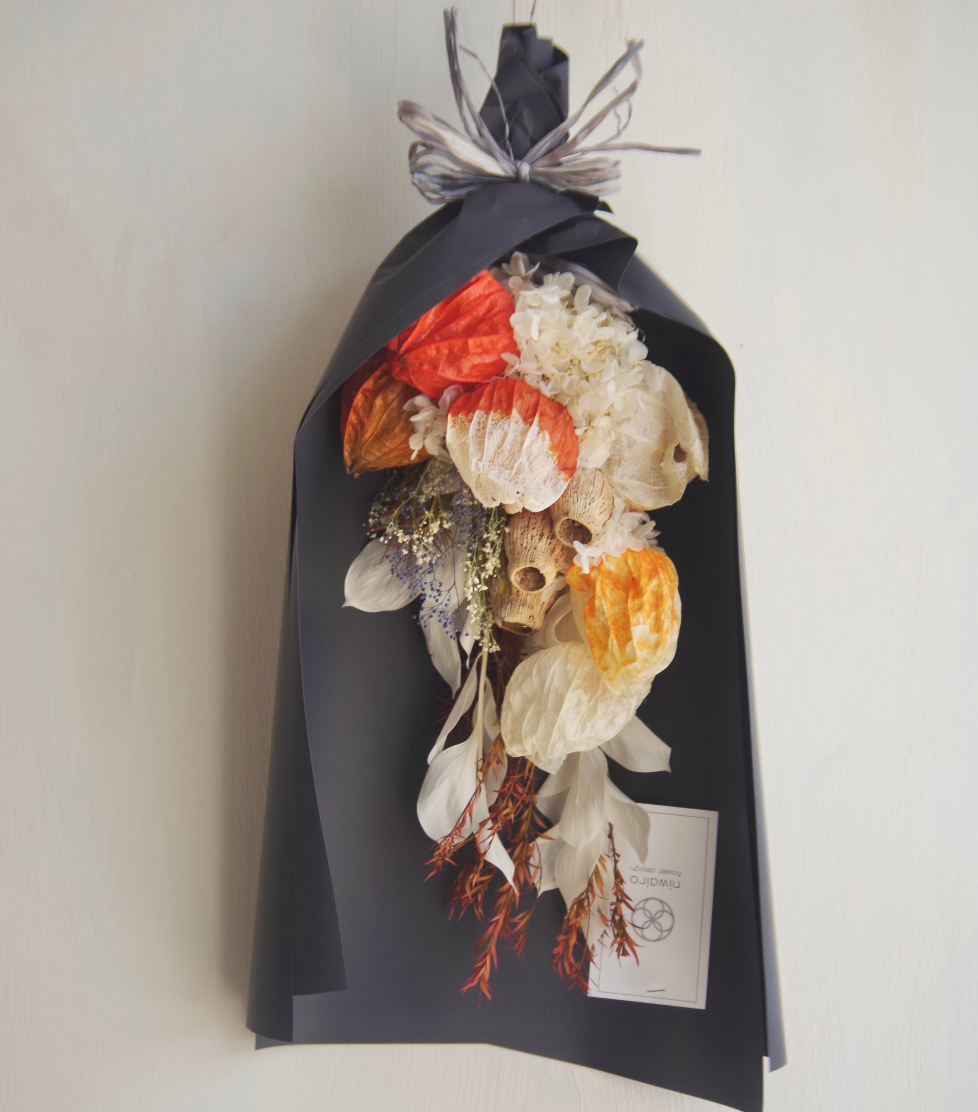 swag "HOOZUKI"は、漂白された鬼灯をメインにしたクールでおしゃれなお手入れ不要のスワッグです。鬼灯は赤みを残して金魚のようなイメージに仕上げ、幅15cm、高さ30cmのサイズ感が存在感を演出しています。お部屋のインテリアやアクセントとして、一味違った雰囲気を演出する必須アイテム。swag "HOOZUKI"があなたのお部屋をオシャレな空間に仕上げます。