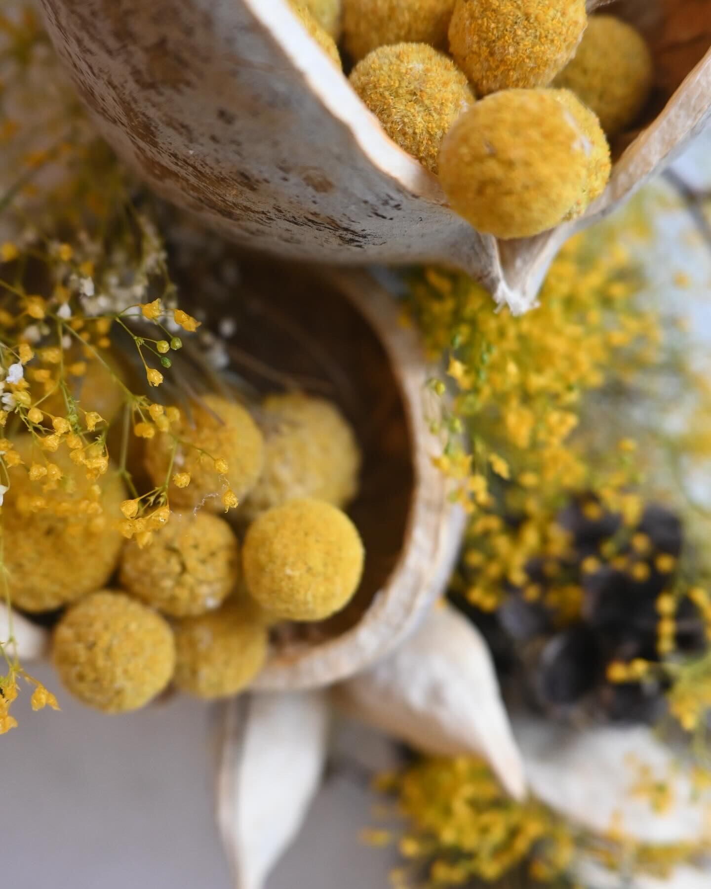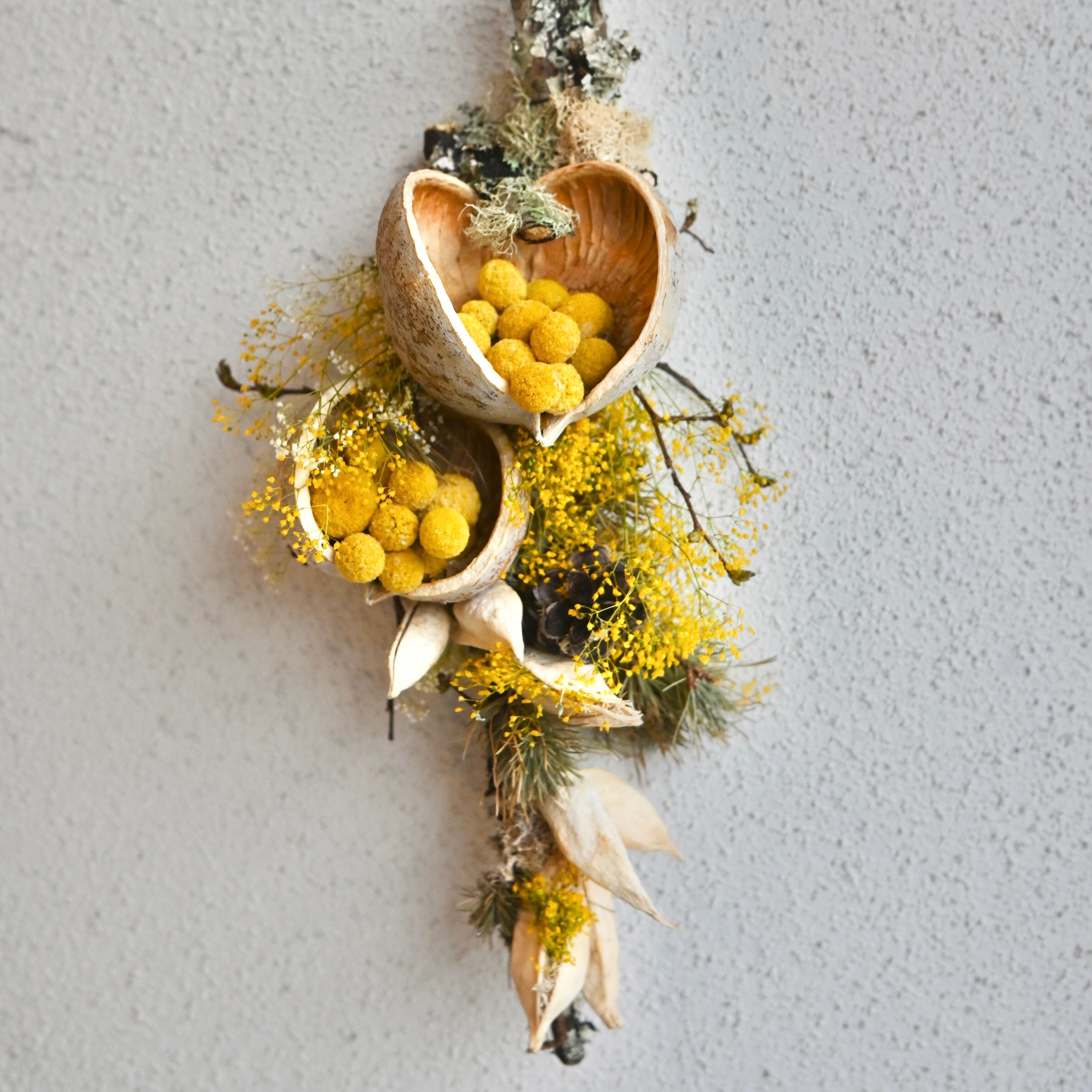 "swag"fruiting"は、お手入れ不要のドライフラワーとプリザーブドフラワーで作られたスワッグです。幅15cm、高さ30cmのサイズで、黄色いクラスペディアを実に見立て、木からこぼれ落ちるようなイメージが特徴です。