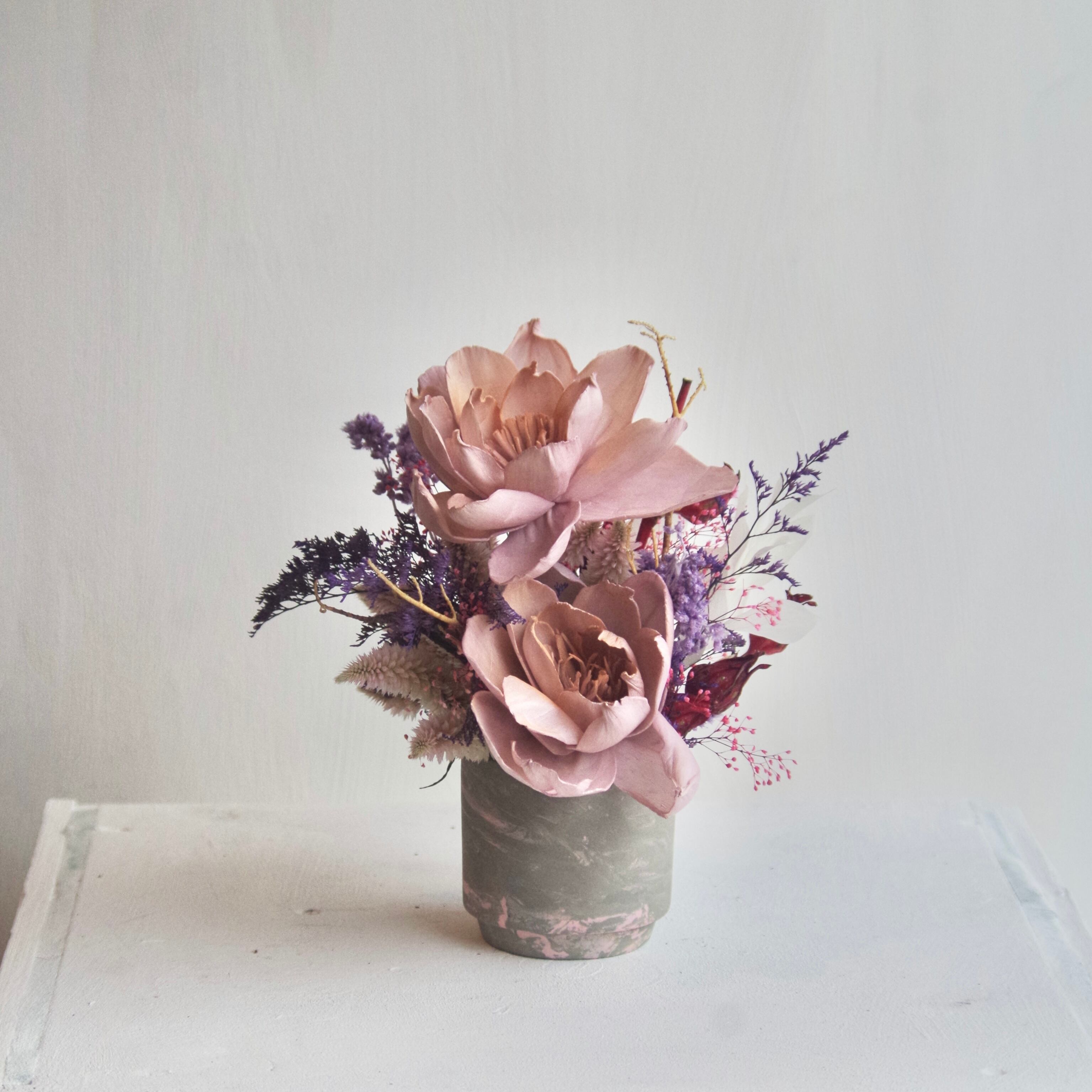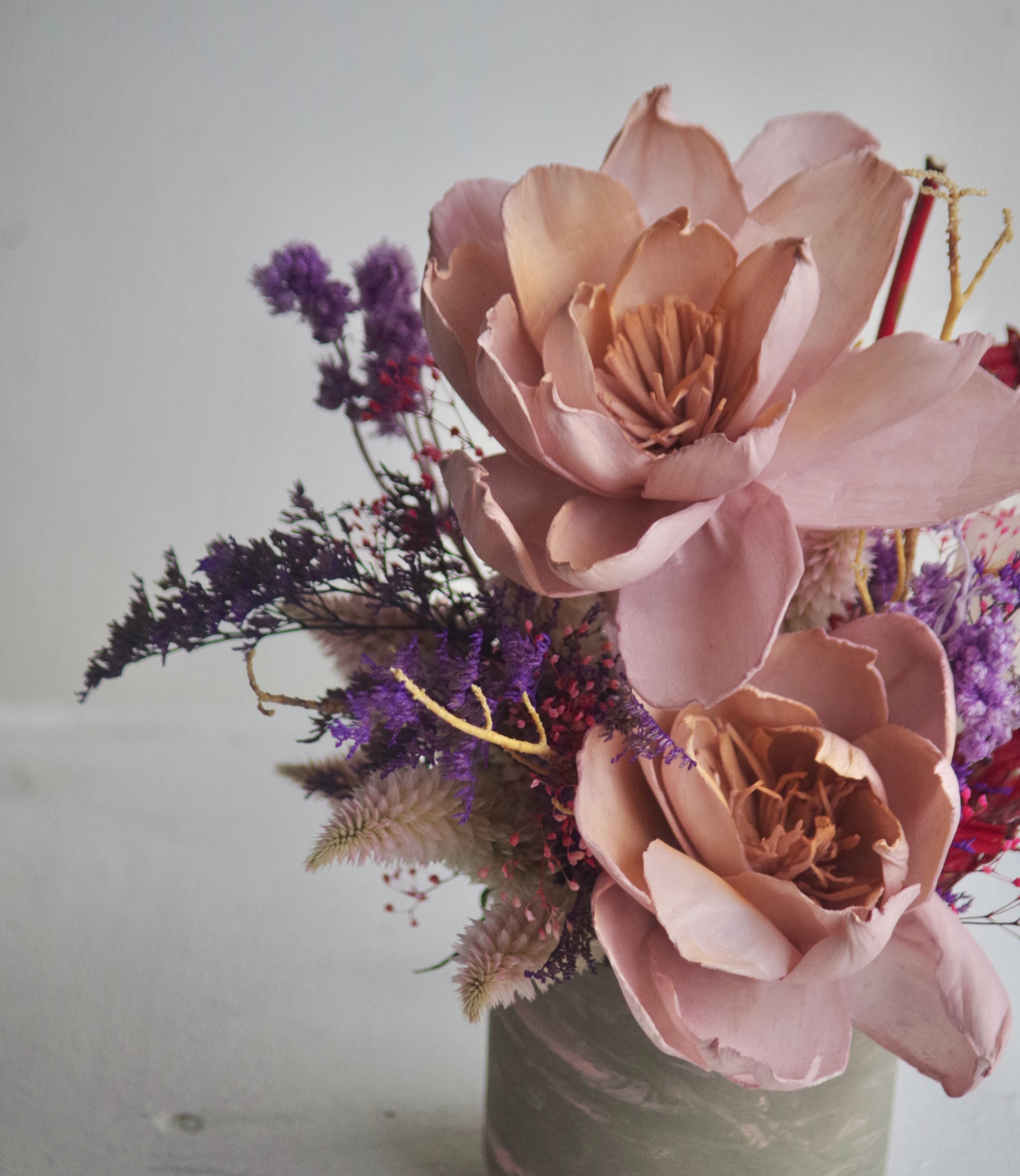 「arrangement"purple"」は、紫色のグラデーションが美しいアレンジメントです。ドライフラワーとプリザーブドフラワーを使用しており、長期間お手入れなしで楽しめるのが魅力。大人可愛いイメージが漂う一品です。